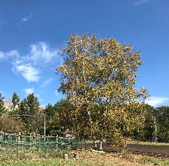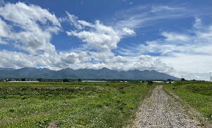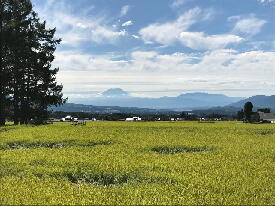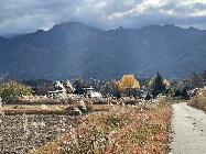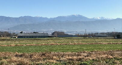 我が家の西側、広い畑地を挟んだ対岸の中央が我が家 当家北側の小径から。妻と散歩中に撮影