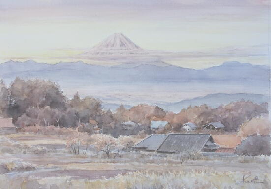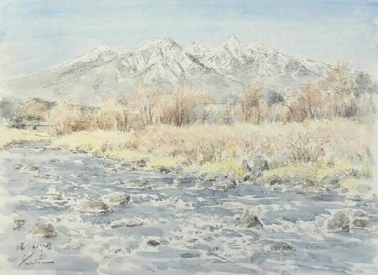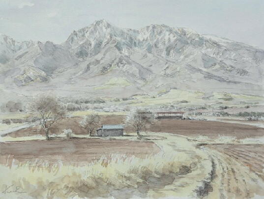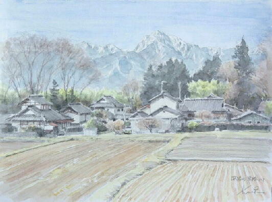 上の絵を描いたのと同じ日、韮崎まで下ってくると寒さも幾分和らいできた。川越しの八ヶ岳をものにできない