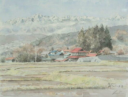 なかなか見い出せない点にある。この絵は原村の丘陵地帯の外れ、家屋と杉木立が画面を引き締めてくれた。