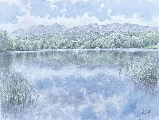 夏になるとよく出かける松原湖。風がないと湖面が鏡となって大きく空を写し出す。