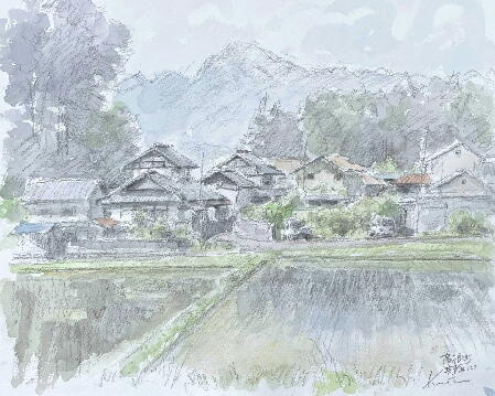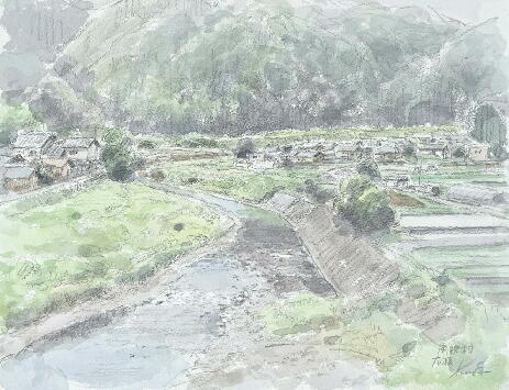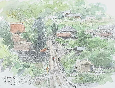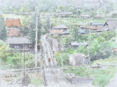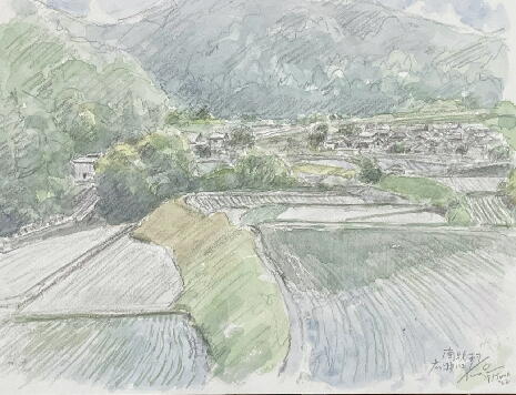 後日同じ集落の高台に足を運んだ。川を見下ろしながらスケッチしていると、