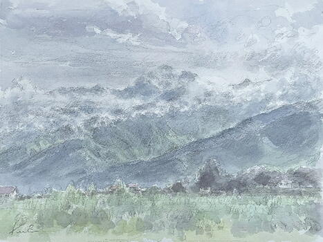 甲斐駒の稜線が見えてきた。そんないっときを何枚か写真に撮り、のちに描き起こした。